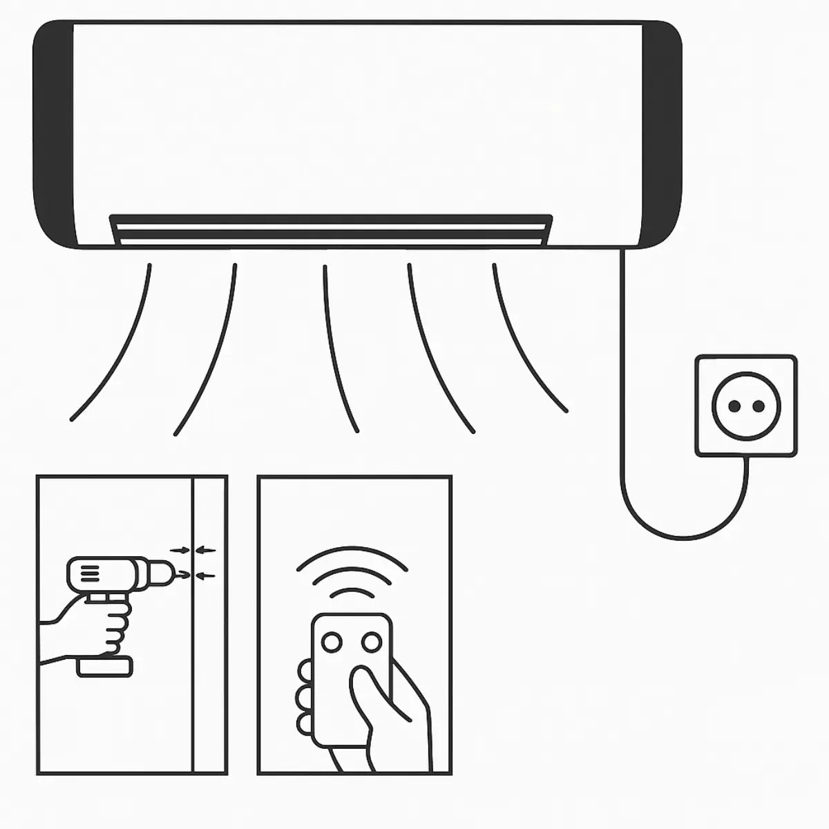 Łatwy montaż, bez konieczności używania jednostki zewnętrznej lub rury...po prostu podłącz go do zwykłego gniazdka elektrycznego